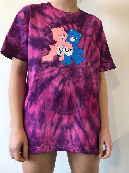 This pink and purple tie dye top features two lovable care bear characters, representing men and women. The hug of the two bears symbolises the bond and love between the genders, and the equality that feminism represents.